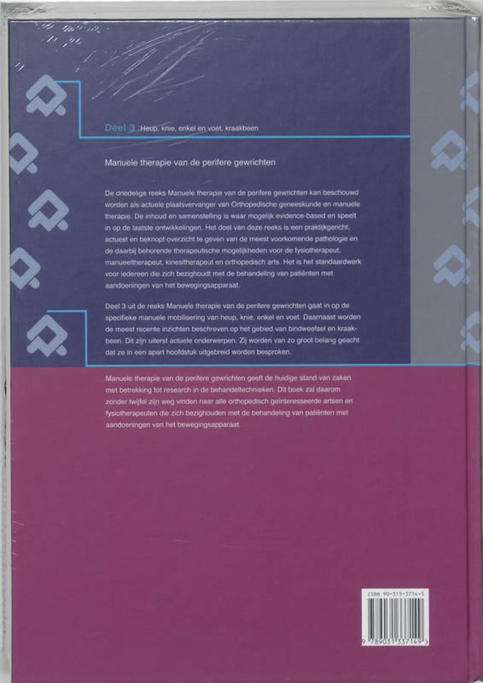 Deel 3 uit de reeks Manuele therapie van de perifere gewrichten gaat in op de specifieke manuele mobilisering van heup, knie, enkel en voet. Daarnaast worden de meest recente inzichten op het gebied van kraakbeen beschreven. Dit uiterst actuele onderwerp wordt in een apart hoofdstuk besproken.Voor wie?Manuele therapie van de perifere gewrichten geeft de huidige stand van zaken met betrekking tot research in de behandeltechnieken. De reeks zal daarom zonder twijfel zijn weg vinden naar alle orthopedisch geïnteresseerde artsen en fysiotherapeuten die zich bezighouden met de behandeling van patiënten met aandoeningen van het bewegingsapparaat.De driedelige reeks Manuele therapie van de perifere gewrichten komt in plaats van het eerder aangekondigde deel 3c, Orthopedische geneeskunde en manuele therapie. De inhoud en samenstelling is geactualiseerd, waar mogelijk evidence-based en inspelend op de laatste ontwikkelingen.Reeds verschenen: Deel 1: algemeen, bindweefsel, schouder - ISBN 90 313 3712 9Deel 2: elleboog, pols en hand - ISBN 90 313 3713 7