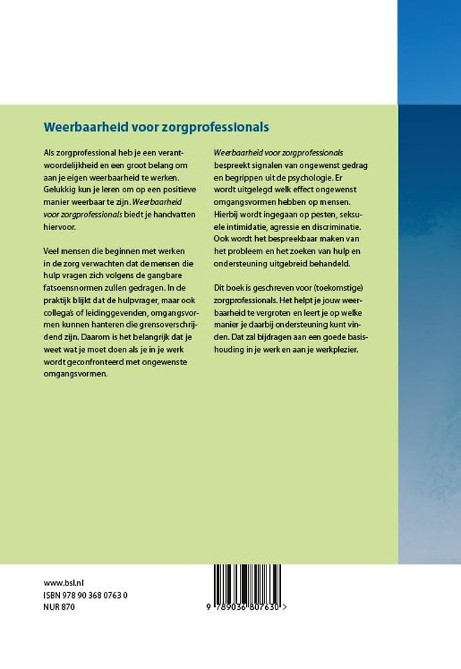 Intimidatie en ongewenst gedrag komt veel voor in de zorg. Zorgprofessionals, of het nu om stagaires, co-assistenten of medewerkers gaat, hebben regelmatig te maken met grensoverschrijdend gedrag van patiënten, collega's en meerderen. Dit boek beoogt praktische handvatten te geven waarmee de zorgprofessional zich hiertegen weerbaar kan maken. Na een inleiding komen thema's aan bod als pesten, intimidatie, discriminatie, agressie en hulp en ondersteuning. Ieder thema begint met oorzaken en redenen en eindigt met praktische handvatten. herkenbare casuïstiek maakt dat het thema uit de taboesfeer wordt gehaald.