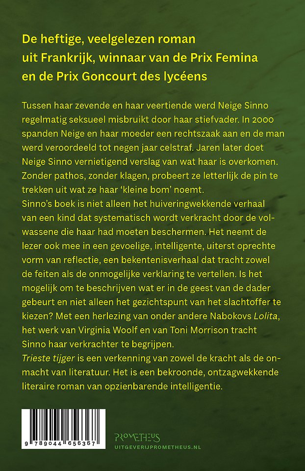 ‘Het is een autobiografisch récit, waarin de auteur indringend en ontroerend beschrijft hoe ze vanaf haar zevende jarenlang door haar stiefvader werd misbruikt. Trieste tijger zit vol literaire interpretaties en verwijzingen (Carrère, Nabokov, Woolf) en vertelt hoe misbruik een heel leven tekent – intens en schokkend, niet in het minst omdat het zo feitelijk is geschreven.’