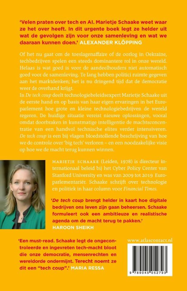In De tech coup deelt technologiebeleidsexpert Marietje Schaake uit de eerste hand en op basis van haar eigen ervaringen in het Europarlement hoe grote en kleine technologiebedrijven de wereld regeren. De huidige situatie vereist nieuwe oplossingen, vooral omdat doorbraken in kunstmatige intelligentie de machtsconcentratie van een handvol technische elites verder intensiveren.