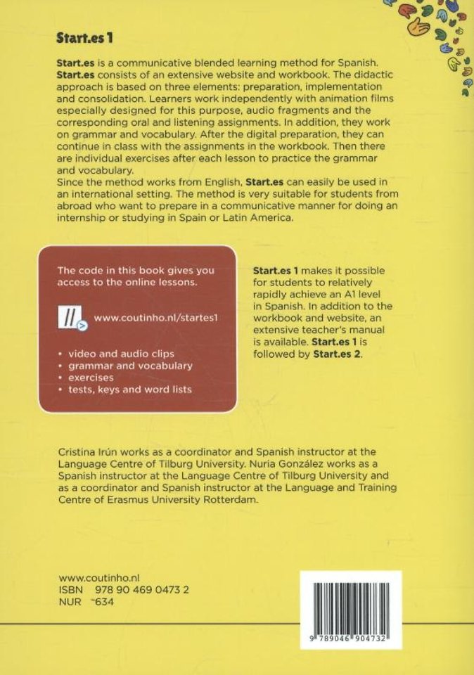Start.es is een methode Spaans voor blended learning. De uitgave bestaat uit een zeer uitgebreide website en een werkboek. De didactiek is gebaseerd op drie pijlers: voorbereiden, uitvoeren en consolideren. Cursisten gaan zelfstandig aan de slag met speciaal hiervoor ontwikkelde animatiefilmpjes, audiofragmenten en de bijbehorende spreek- en luisteropdrachten. Daarnaast werken zij aan grammatica en woordenschat. Na de digitale voorbereiding kunnen ze in de les verder met de opdrachten in het werkboek. Vervolgens zijn er na elke les individuele oefeningen om de geleerde grammatica en woordenschat in te slijpen. Omdat de steuntaal in het Engels is, is Start.es ook prima te gebruiken in een internationale setting. Zo is de methode is bij uitstek geschikt voor (internationale) studenten die een tijd naar Spanje of Latijns-Amerika gaan.