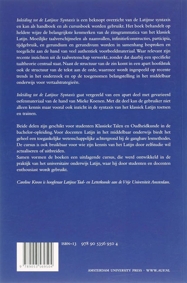 Inleiding tot de Latijnse syntaxis is een beknopt, op moderne wetenschappelijke inzichten gebaseerd overzicht van de Latijnse syntaxis, opgezet als cursusboek. Op een heldere manier worden aan de hand van aansprekende voorbeelden de belangrijkste kenmerken van de Latijnse zinsgrammatica behandeld. Hierbij ligt de nadruk meer op het verwerven van in