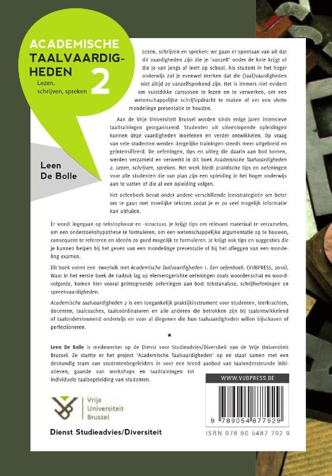 Aan de Vrije Universiteit Brussel worden sinds enige jaren intensieve taaltrainingen georganiseerd. Studenten uit uiteenlopende opleidingen kunnen deze vaardigheden inoefenen en verder ontwikkelen. Op vraag van vele studenten werden dergelijke trainingen steeds meer uitgebreid en geïntensifieerd. De oefeningen, tips en uitleg die daarin aan bod komen, werden verzameld en verwerkt in dit boek Academische Taalvaardigheden 2. Lezen, schrijven, spreken. Het werk biedt praktische tips en oefeningen voor alle studenten die van plan zijn een opleiding in het hoger onderwijs aan te vatten of die al een opleiding volgen.