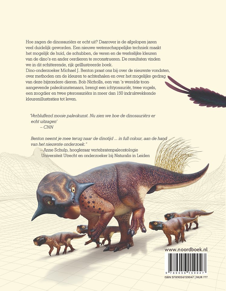 Dino-onderzoeker Michael J. Benton praat u bij over de nieuwste vondsten, over methoden om de kleuren te achterhalen en over het mogelijke gedrag van deze bijzondere dieren. Bob Nicholls, een van ’s werelds toonaangevende paleokunstenaars, brengt een ichtyosauriër, twee vogels, een zoogdier en twee pterosauriërs in meer dan 150 kleurenillustraties tot leven.