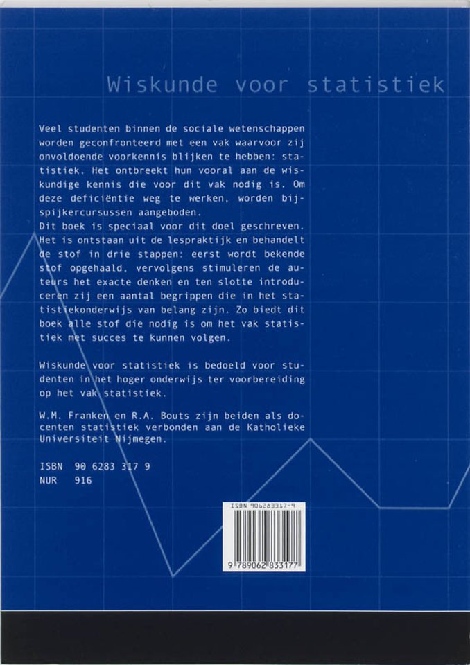 Veel studenten in het hoger onderwijs die een gamma studie volgen worden geconfronteerd met een vak waarvoor zij onvoldoende voorkennis blijken te hebben: statistiek. Het ontbreekt hun vooral aan de wiskundige kennis die voor dit vak nodig is. Om deze deficiëntie weg te werken, worden bijspijkercursussen aangeboden. Wiskunde voor statistiek is speciaal voor dit doel geschreven.