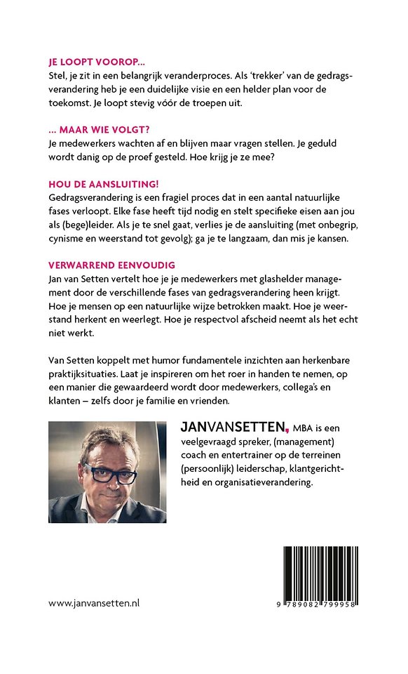 Meer over Jan van SettenVERWARREND EENVOUDIG Jan van Setten vertelt in zijn klassieker ‘Hoe krijg ik ze zover?’ hoe je je medewerkers met glashelder management door de verschillende fases van gedragsverandering heen krijgt. Hoe je mensen op een natuurlijke wijze betrokken maakt. Hoe je weerstand herkent en weerlegt. Hoe je respectvol afscheid neemt als het echt niet werkt. JE LOOPT VOOROP Stel, je zit in een belangrijk veranderproces. Als ‘trekker’ van de gedragsverandering heb je een duidelijke visie en een helder plan voor de toekomst. Je loopt stevig vóór de troepen uit. …MAAR WIE VOLGT? Je medewerkers wachten af en blijven maar vragen stellen. Je geduld wordt danig op de proef gesteld. Hoe krijg je ze mee? HOU DE AANSLUITING Gedragsverandering is een fragiel proces dat in een aantal natuurlijke fases verloopt. Elke fase heeft tijd nodig en stelt specifieke eisen aan jou als (bege)leider. Als je te snel gaat, verlies je de aansluiting (met onbegrip, cynisme en weerstand tot gevolg); ga je te langzaam, dan mis je kansen. Van Setten koppelt met humor fundamentele inzichten aan herkenbare praktijksituaties. Laat je inspireren om het roer in handen te nemen, op een manier die gewaardeerd wordt door medewerkers, collega’s en klanten – zelfs door je familie en vrienden.