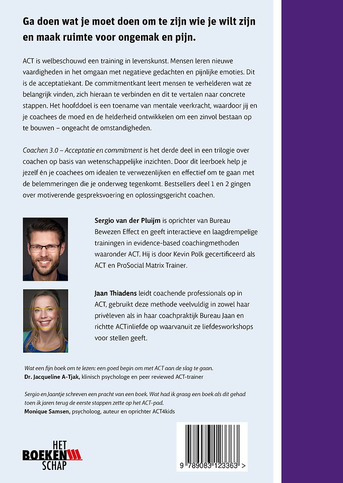 Coachen 3.0 – Acceptatie en commitment is het derde deel in de trilogie over coachen op basis van wetenschappelijke inzichten. Je kunt dit boek zowel lezen als zelfhulpboek wanneer je als coachende professional de nieuwste inzichten in de psychologie wilt leren toepassen.