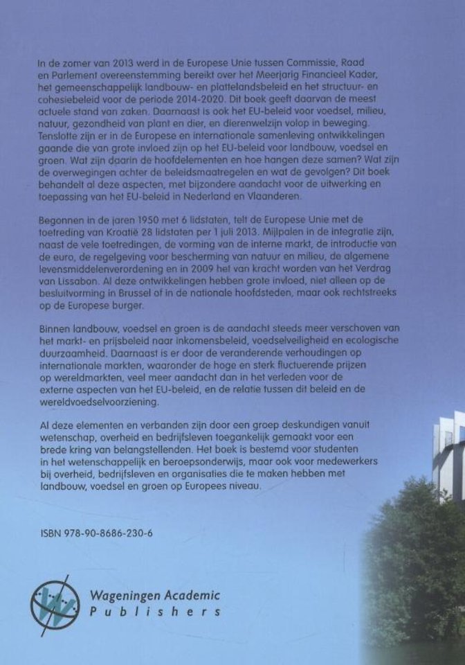 Deze materie is door een groep deskundigen vanuit wetenschap, overheid en bedrijfsleven toegankelijk gemaakt voor een brede kring belangstellenden. Het boek is bestemd voor studenten in het wetenschappelijk- en beroepsonderwijs maar ook voor medewerkers bij overheid, bedrijfsleven en organisaties die te maken hebben met landbouw, voedsel en groen op Europees niveau.