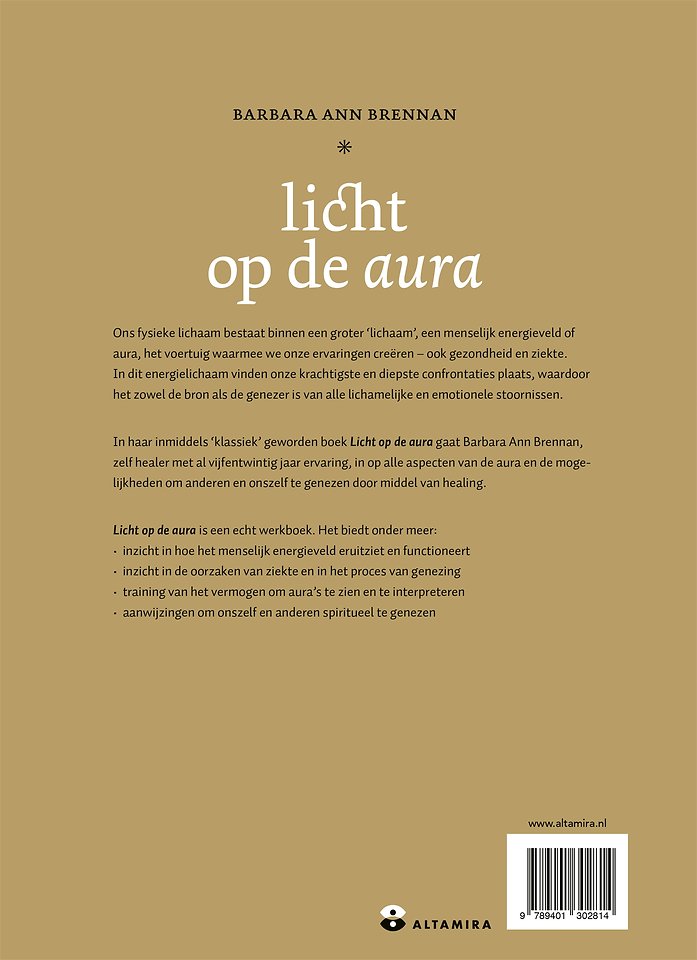 'Licht op de aura' van Barbara Ann Brennan bespreekt alle aspecten van de aura en de mogelijkheden om onszelf en anderen te genezen door middel van healing. Ons menselijke energieveld - de aura - is één met ons en reflecteert onze ervaringen, gezondheid en onze geest. In dit energielichaam vinden onze krachtigste en diepste confrontaties plaats, waardoor het zowel de bron als de genezer kan zijn van alle lichamelijke en emotionele stoornissen. Hierdoor biedt 'Licht op de aura' niet alleen inzicht in het menselijk energieveld, maar ook inzicht in de oorzaken van ziektes, het proces van genezing en het vermogen om aura's te zien en te interpreteren. Met 'Licht op de aura' ligt spirituele genezing binnen handbereik.