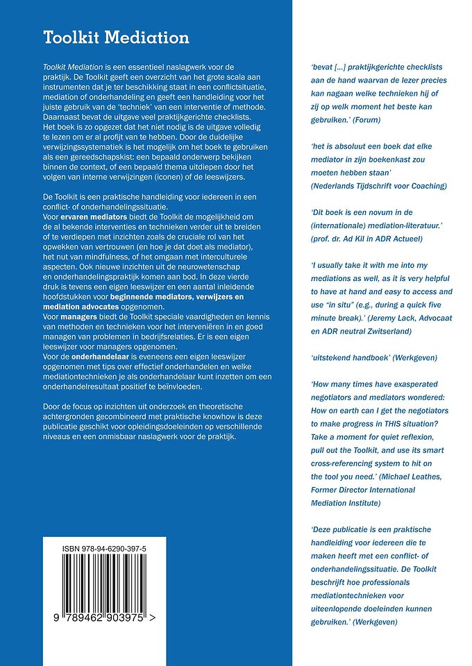 De Toolkit is een praktische handleiding voor iedereen in een conflict- of onderhandelingssituatie. Voor ervaren mediators biedt de Toolkit de mogelijkheid om de al bekende interventies en technieken verder uit te breiden of te verdiepen met inzichten zoals de cruciale rol van het opwekken van vertrouwen (en hoe je dat doet als mediator), het nut van mindfulness, of het omgaan met interculturele aspecten. Ook nieuwe inzichten uit de neurowetenschap en onderhandelingspraktijk komen aan bod. In deze vierde druk is tevens een eigen leeswijzer en een aantal inleidende hoofdstukken voor beginnende mediators opgenomen. Voor managers biedt de Toolkit speciale vaardigheden en kennis van methoden en technieken voor het interveniëren in en goed managen van problemen in bedrijfsrelaties. Er is een eigen leeswijzer voor managers opgenomen. Voor de onderhandelaar is eveneens een eigen leeswijzer opgenomen met tips over effectief onderhandelen en welke mediationtechnieken je als onderhandelaar kunt inzetten om een onderhandelresultaat positief te beïnvloeden.