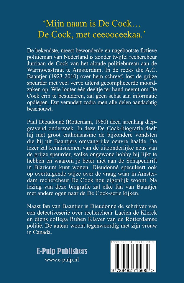 Paul Dieudonné deed jarenlang diepgravend onderzoek. In deze De Cock-biografie deelt hij met groot enthousiasme de bijzondere vondsten die hij uit Baantjers omvangrijke oeuvre haalde. De lezer zal kennisnemen van de uitzonderlijke neus van de grijze speurder, welke ongewone hobby hij lijkt te hebben en waarom je beter niet aan de Schapendrift in Blaricum kunt wonen. Dieudonné speculeert ook op overtuigende wijze over de vraag waar in Amsterdam rechercheur De Cock nou eigenlijk woont. Na lezing van deze biografie zal elke fan van Baantjer met andere ogen naar de De Cock-serie kijken.